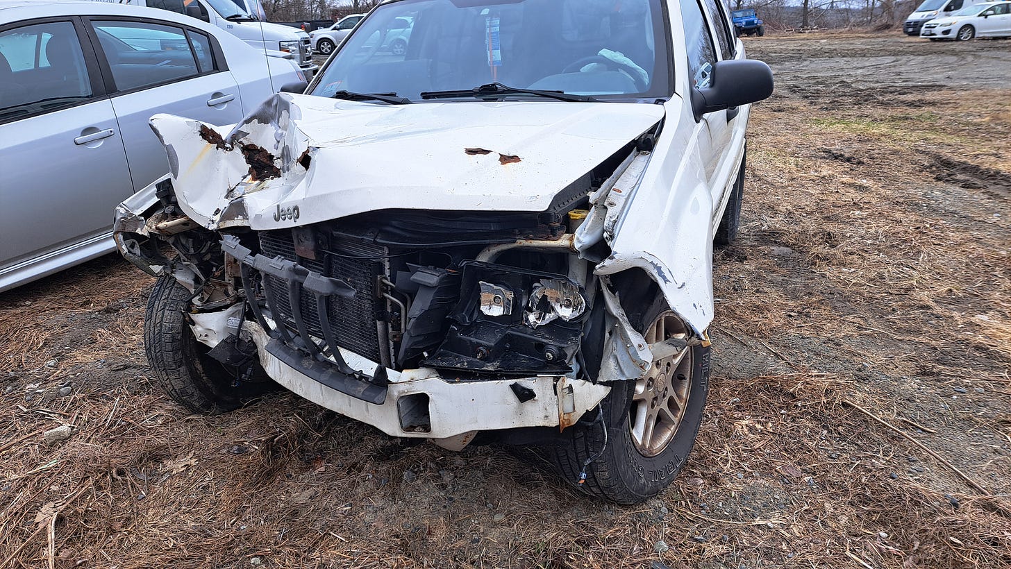 My car, after an impossible-to-avoid crash caused by a total failure of my car’s brakes in a heavily trafficked neighborhood.